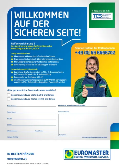Willkommen auf der sicheren Seite! Mit der günstigen Reifenversicherung von EUROMASTER erwerben Sie ein Rundum-Sorglos-Paket für Ihre neuen Reifen.